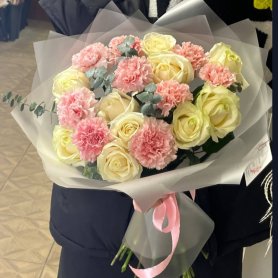 Нежный букет из белых роз и диантуса