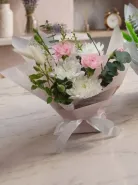 Нежные оттенки розового и белого создают утонченную композицию, наполненную свежестью и легкостью. Этот букет станет изящным акцентом в любом интерьере, привнося в него нотки весеннего настроения.