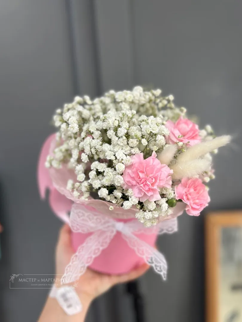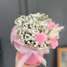 Букет «Нежное облако» выполнен в шляпной коробке и идеально подойдет для передачи тёплых чувств. В его составе нежные гипсофила и диантус кустовой создают легкую и воздушную атмосферу.
