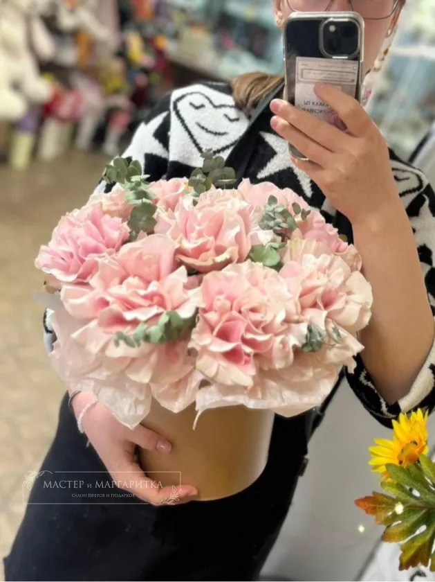 Оригинальная композиция с французскими розами , любителям порадовать необычными подарками своих близких людей!