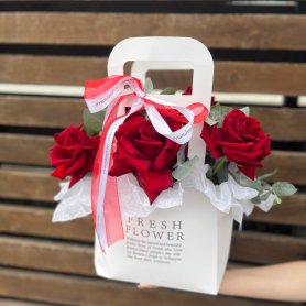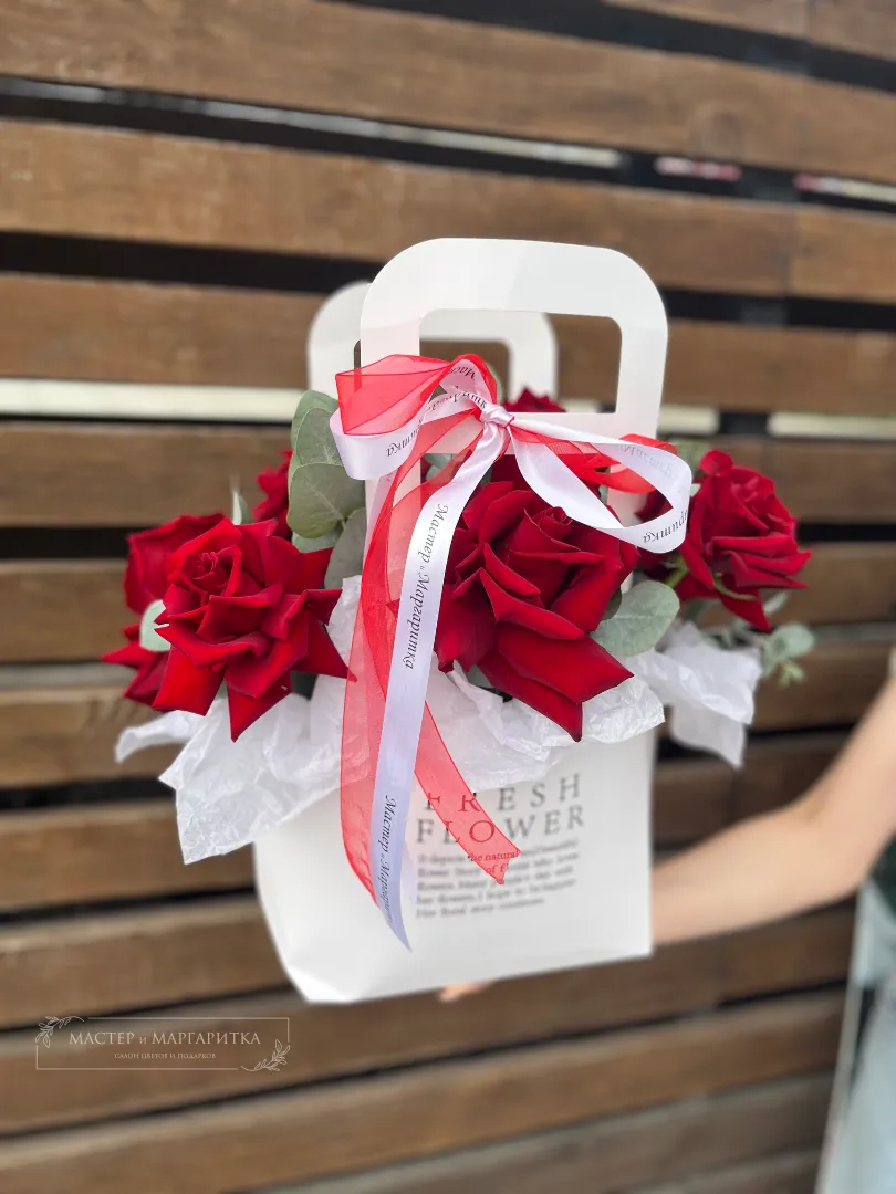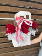 Оригинальная композиция из французской розы в сумочке. Благодаря губке очень долго сохраняется свежесть цветов при правильном уходе.